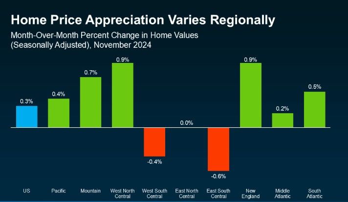 Meanwhile, other regions saw slight month-over-month declines in November, according to Federal Housing Finance Agency (FHFA) data (see graph below):